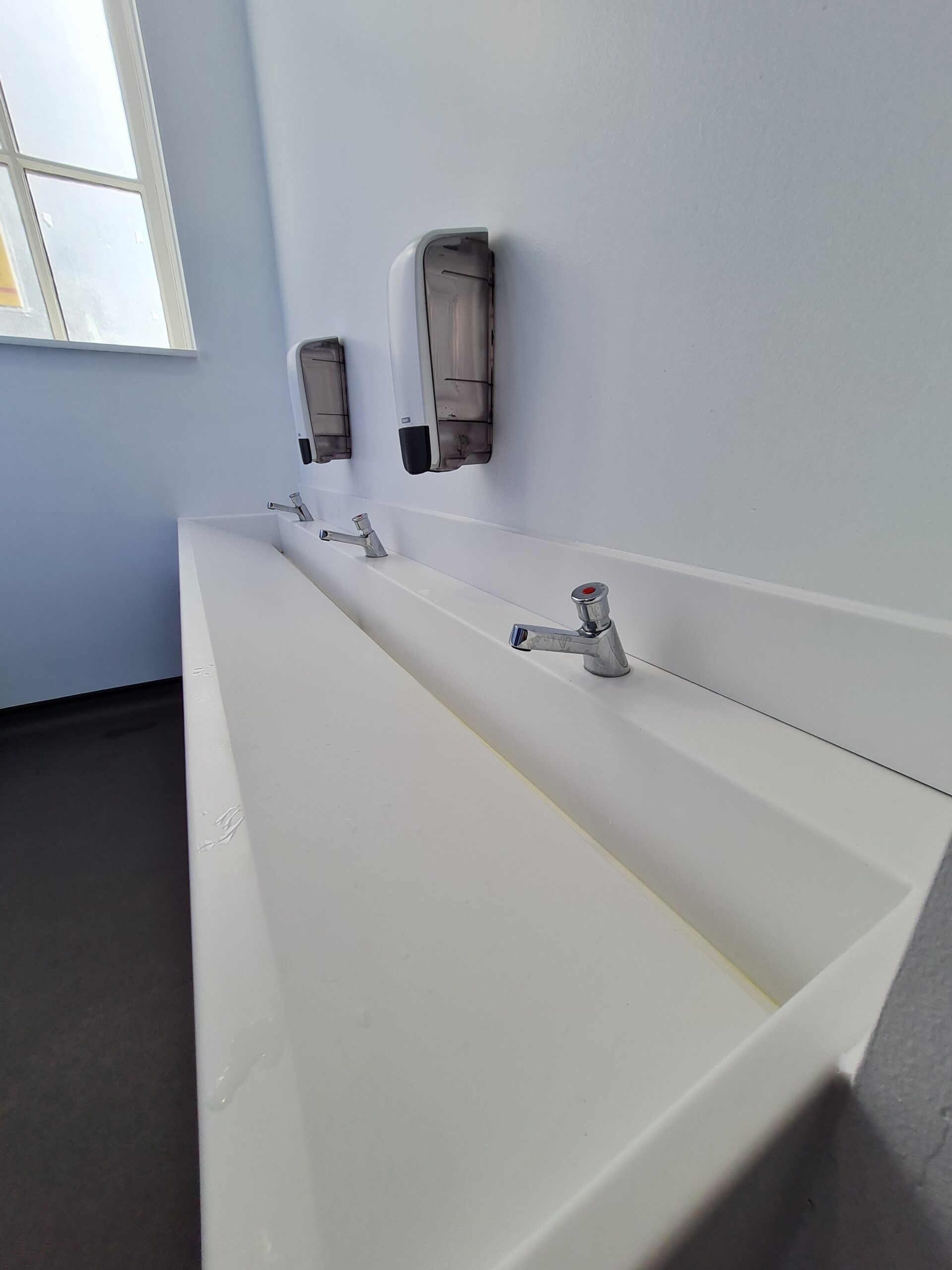 The refurbishment was carried out in the summer months. Originally CFBL School contacted Interfix with a very tight timeline towards the end of the final school term. Knowing how important it was for the client (CFBL School) for the work to be completed during the summer holidays, we pulled together our resources to achieve this. The school took care of the strip out and electrical work, saving us time. Interfix then installed full height cubicles, wall hung toilets, solid surface wash troughs with push taps and vinyl flooring. After the installation was completed, we decorated the washroom walls.