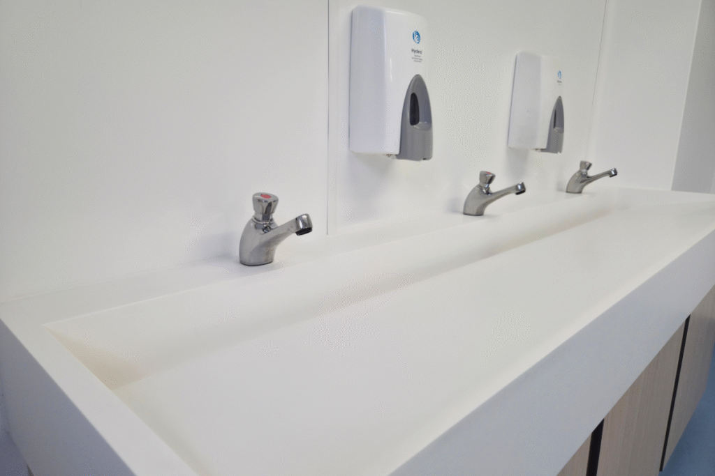 To replace the outdated handwashing setup, Interfix installed modern solid surface wash troughs, chosen for their: