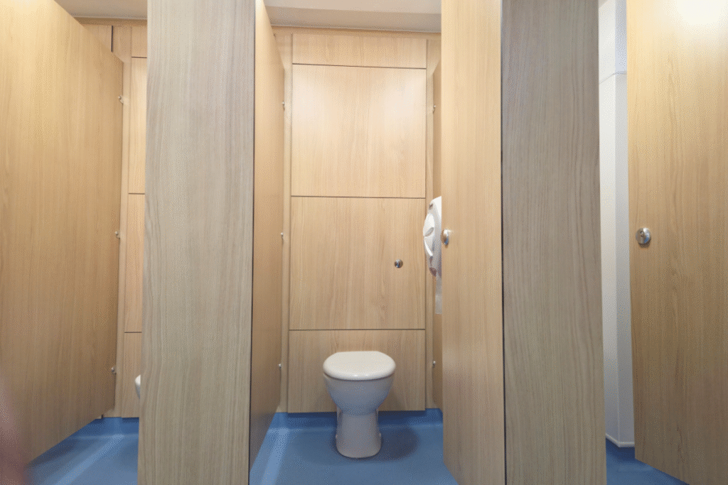 - Outdated and failing fixtures: cubicles were worn and beginning to fall apart, creating both hygiene concerns and ongoing maintenance costs.