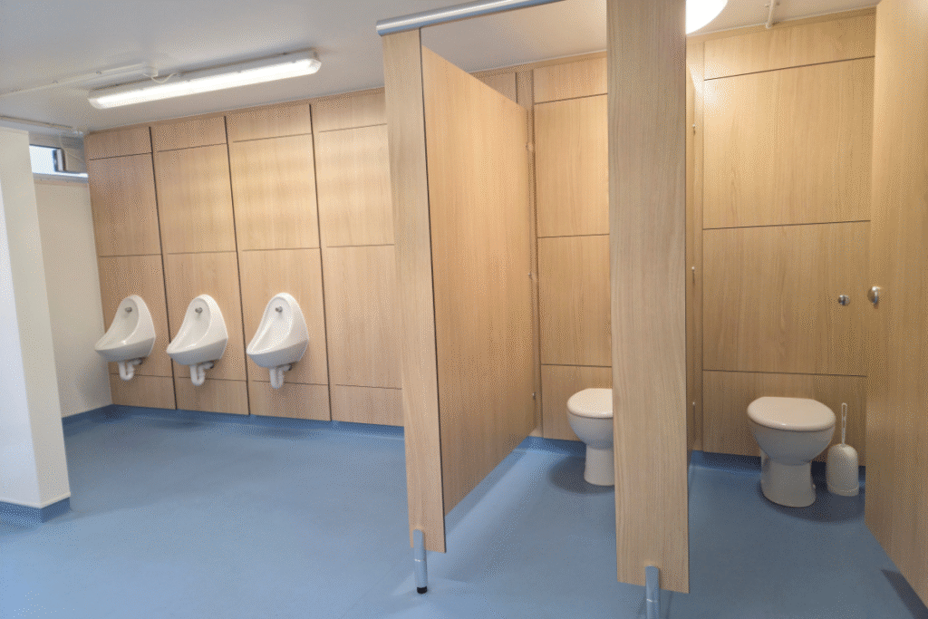 Vinyl flooring, Solid material wash troughs, SGL cubicles, SGL WC ducts, Hygienic wall cladding, Push taps, Washroom design, Washroom installation and fit out.