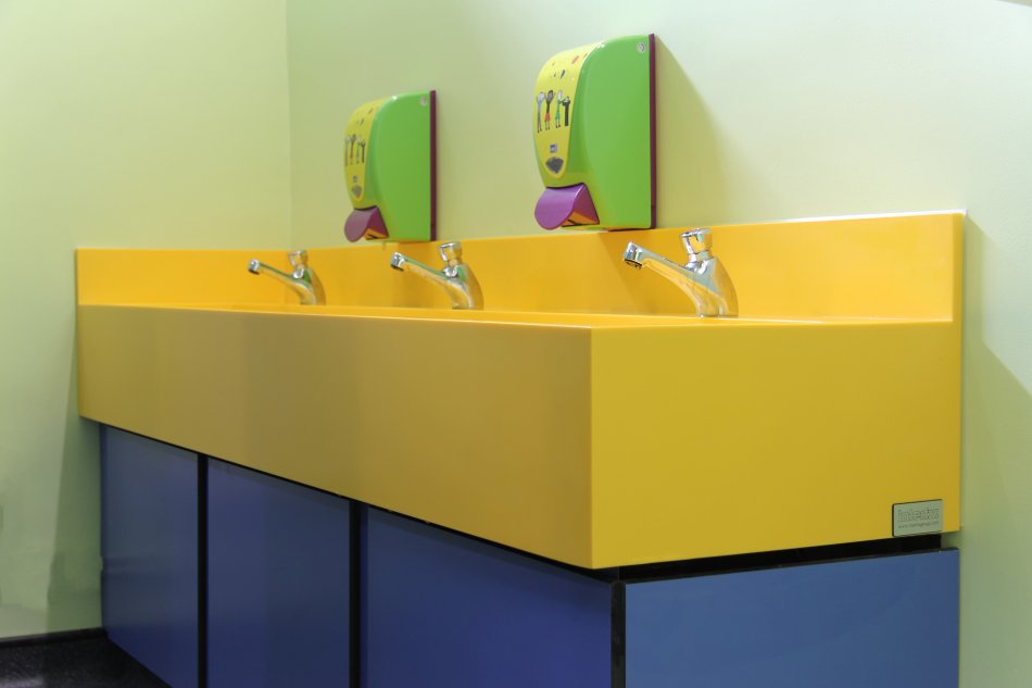 For older kids, water-proof and vandal resistant cubicle panels can be considered. For kids aged 11 and above who do Physical Education, changing facilities and showers must be provided. Hand washing areas can be passively supervised, but cubicles should definitely be private. And when it comes to hand washing, liquid soap dispensers and hand towels are the most hygienic option.